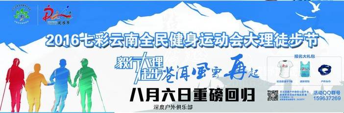 2016七彩云南大理全民健身徒步节在各级政府部门的高度重视和广大徒步爱好者的关心和支持下,定于2016年8月6日在大理全民健身中心东广场举行。将于2016 年4月29日正式开放报名。本届徒步节设有:60KM徒步组、40KM徒步组、15公里体验组3个组别,请各位户外爱 好相互转告,及时报名,“东方日内瓦,一生不能不到的城市”欢迎您来感受“风花雪月”之美。