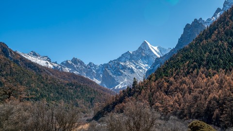 央迈勇雪山藏语意为“文殊菩萨”,为“三怙主”雪山的南峰,海拔6033米,位列“三怙主”雪山之首,代表智慧,是稻城县海拔最高峰。