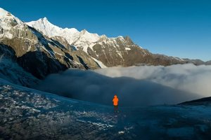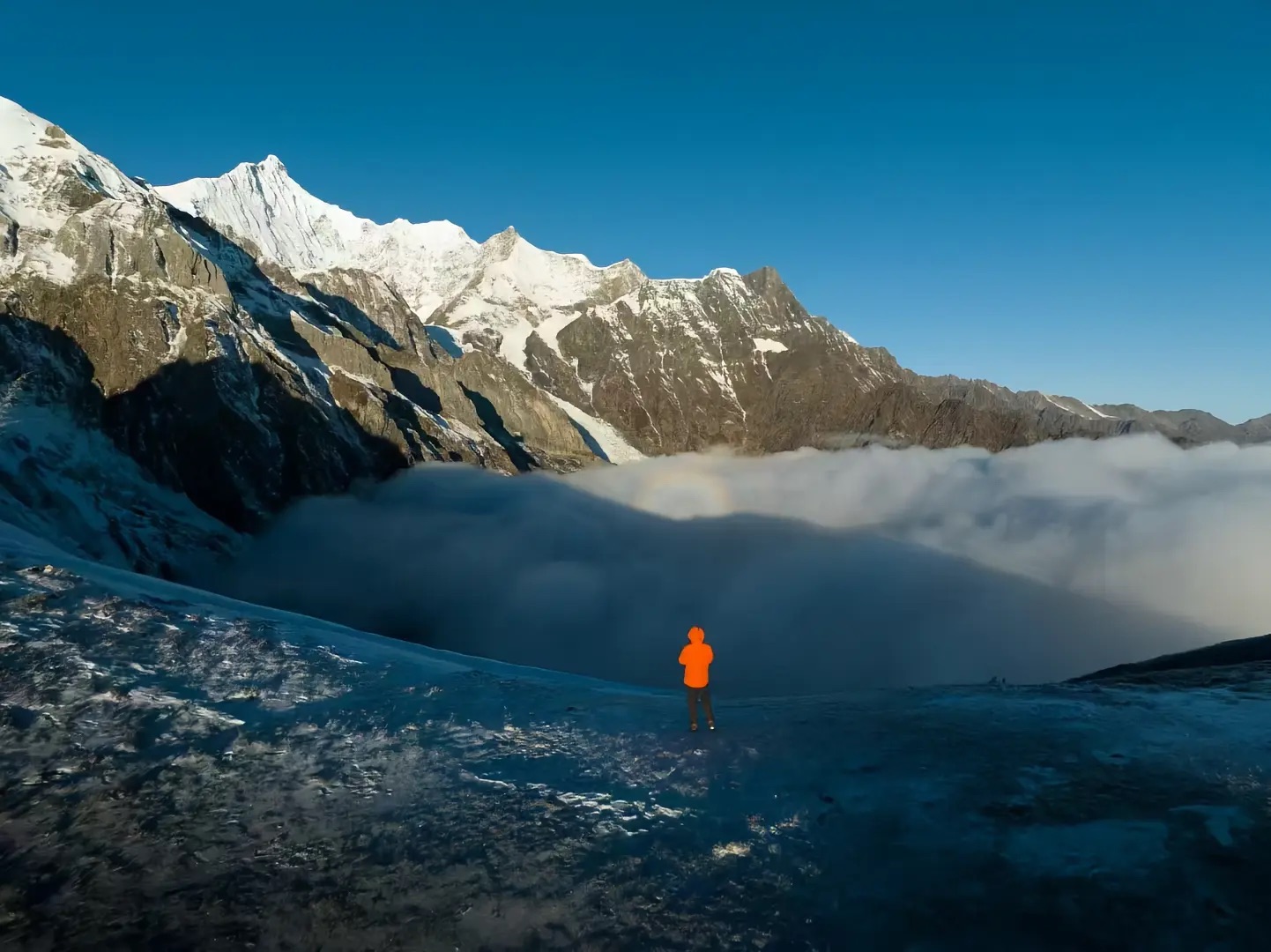 ▲ 崩格顶营地身后的白马雪山云海及卡瓦格博下方谷地的云海,傍晚时分还能欣赏到白马的日落金山