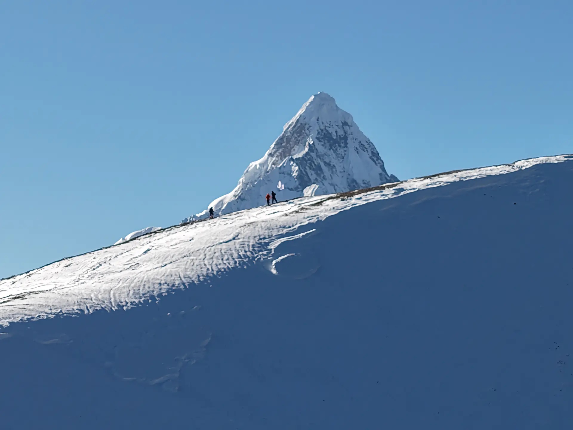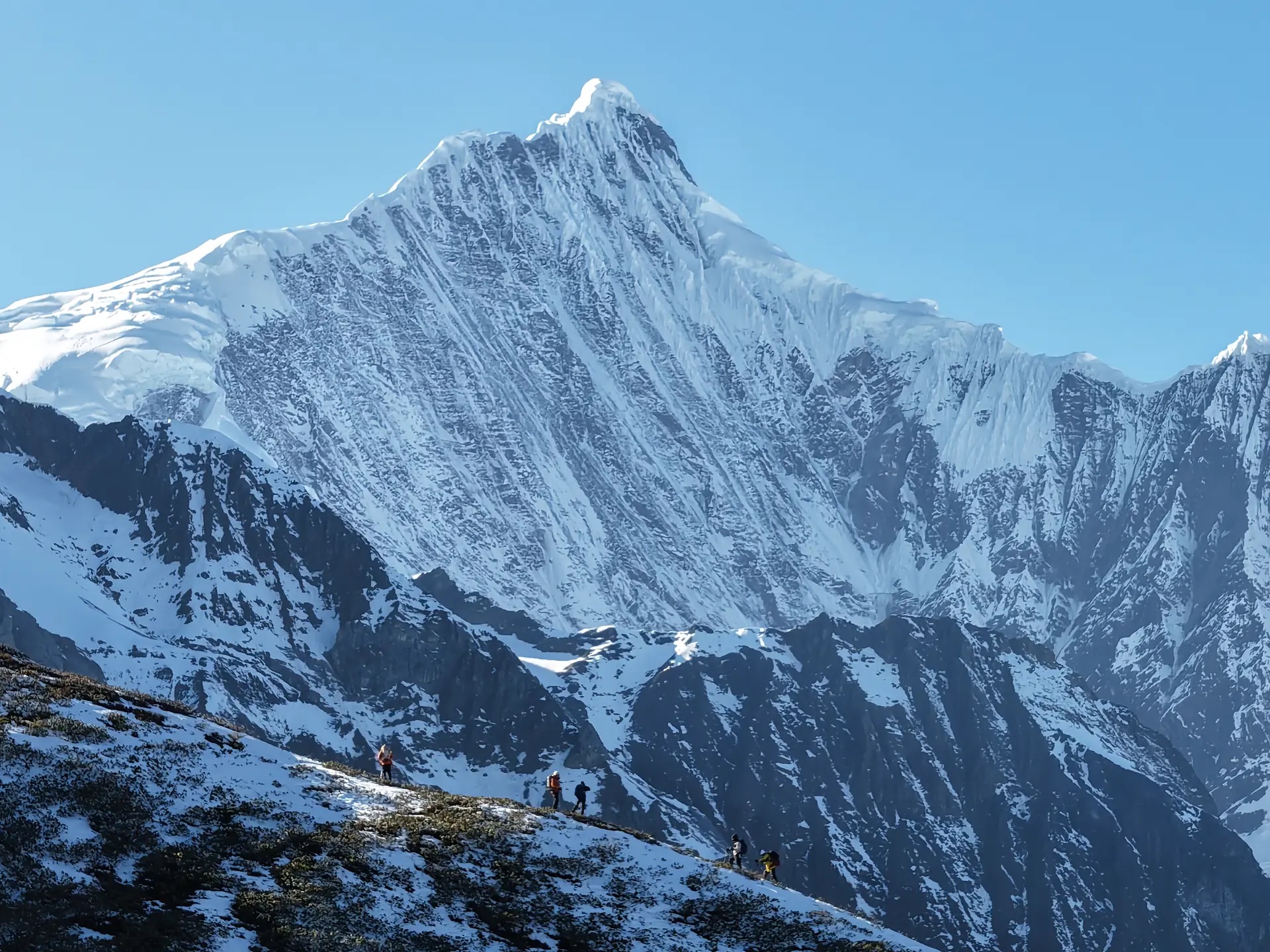 ▲ 崩格顶的山脊,在永恒的卡瓦格博面前,人类的剪影显得如此单薄。