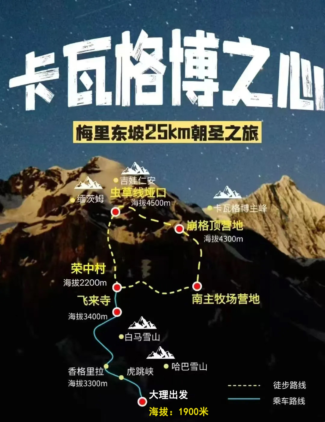 路线起源:2020年疫情期间由永宗村村民阿玛及其团队意外发现并开发历时两年,终于开发出一条全新的梅里雪山朝觐路线。